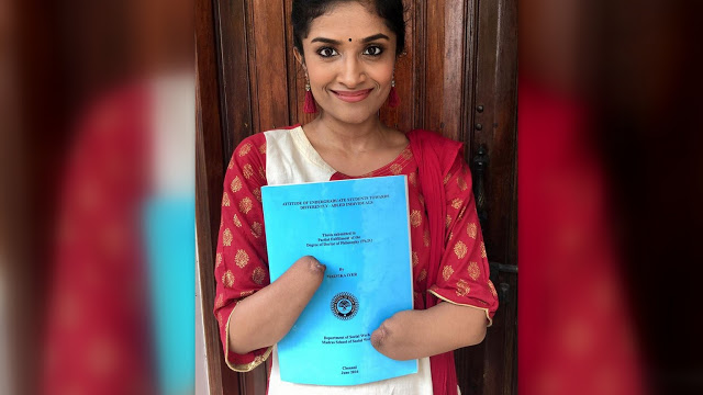 “Say hello to Dr. Malvika Iyer. PS: To everyone who’s been curious as to how I type, do you see that bone protruding from my right hand? That’s my one and only extraordinary finger. I even typed my Ph.D. thesis with it.”