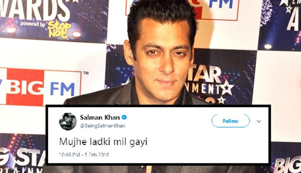 Mujhe ladki mil gayi— Salman Khan (@BeingSalmanKhan) February 6, 2018