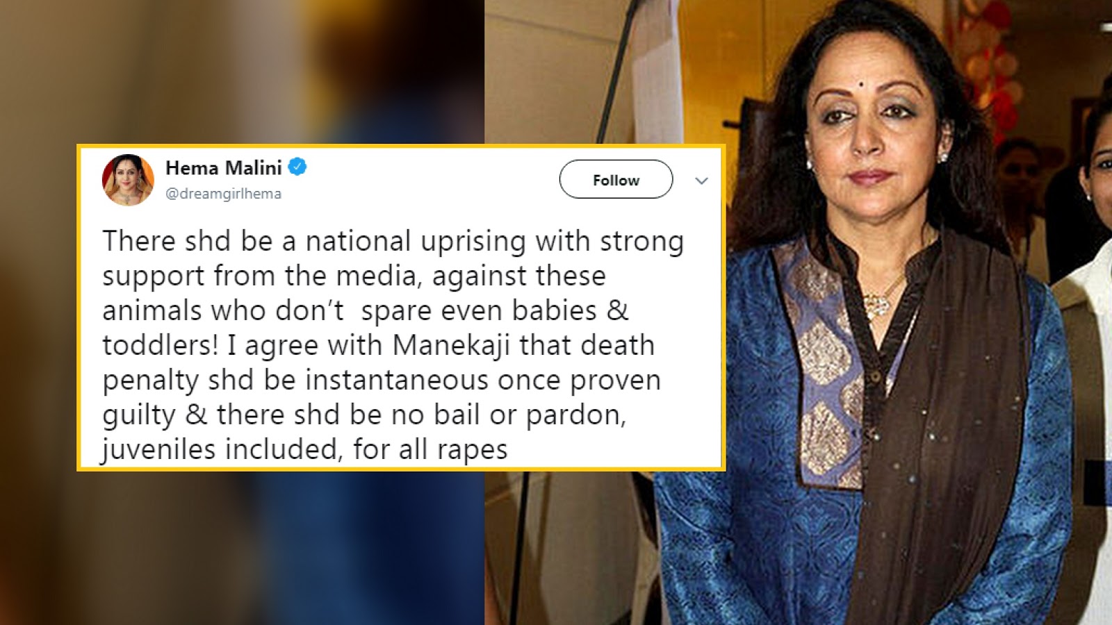 There shd be a national uprising with strong support from the media, against these animals who don’t spare even babies & toddlers! I agree with Manekaji that death penalty shd be instantaneous once proven guilty & there shd be no bail or pardon, juveniles included, for all rapes— Hema Malini (@dreamgirlhema) April 14, 2018